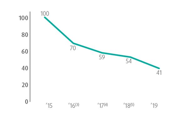 In 2019, the impact of metal emissions to air fell by 59% compared to 2015, mainly thanks to further efforts to improve filtration and process efficiency.