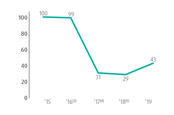 Compared to 2015, after correction for activity levels, the impact of metal emissions to water in 2019 fell by 57% largely thanks to improvement projects on our sites. Compared to 2018, short-term and temporarily reduced efficiency at the Hoboken treatment plant in 2019, combined with higher activity levels, led to an increased impact to water. Our overall reduction compared to 2015 shows that we remain committed to the continuous improvement goals defined in Horizon 2020.
